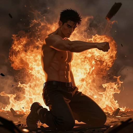 Muscular man with long brown hair, shirtless, holding large ornate sword overhead with right arm, left arm outstretched. Black wristbands, brown necklace. Background: clear blue sky, turquoise sea, dry grassy shore. Single, dried plant to right. Sunlight.