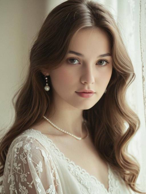 a professional photographic portrait of an attractive young female, wearing elegant pearl earrings and an evening gown, with perfect eyes and slim body, white background, photographed by Tim Walker, 4K