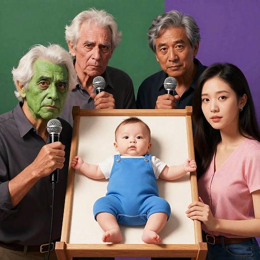 Illustration of a group of people in the foreground. Central figures: a nervous man with glasses, brown plaid suit, and red tie; a woman with black curly hair, gray top with floral embroidery. Background: various people with neutral expressions. Bright yellow background. Styles: comic, exaggerated features. Total: 9 people.