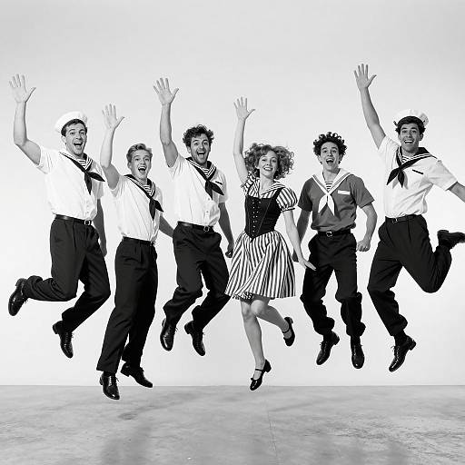 three women jumping with arms raised. Left woman wears striped sleeveless top and black pants. Center woman wears crop top and white shorts. Right woman wears black top and pants. All have intense, open-mouthed expressions. Background is cloudy sky. All women are touching hands.