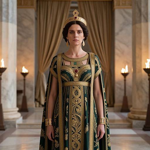 eyes wide shut costume woman, photorealistic portrait of a young woman, traditional Middle Eastern attire, long braided black hair, red scarf, ornate gold headpiece, colorful embroidered robes, soft lighting, blurred background with wooden candelabras, calm expression, detailed ures, T2I style, realistic painting, traditional clothing, intricate patterns