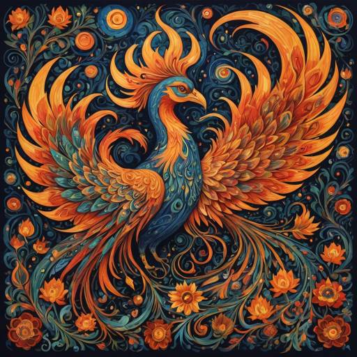 Intricate ASCII art of a mythical phoenix with vibrant feathers, carefully crafted using flowing lines