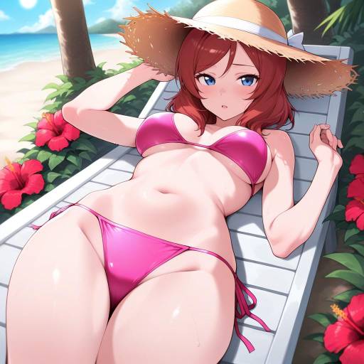 confident high school girl, medium straight hair, athletic build, (bikini:1.3), bright pink bikini, light beach wrap, Seinen/Realistic Style, Soft blush pink