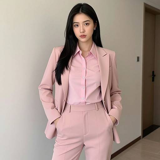 Best prompts for pink striped pantsuit