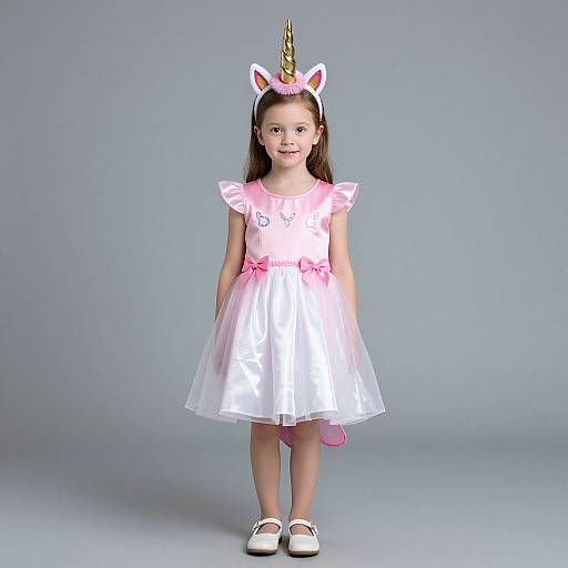 rainbow unicorn costume,1girl, solo, single horn, horns, pink hair, dress, long hair, animal ears, personification, bare shoulders, realistic, breasts