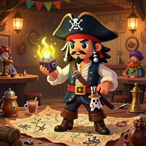 A pirate captain depicted in a whimsical 3D animation. She wears a tattered captain's coat and has a parrot perched on her shoulder. In one hand, she holds a treasure map while her other arm supports a chest overflowing with gold coins. Her coat pockets contain a compass and a spyglass, with a tattered flag draped over her shoulder, all in ultra-detailed 4K, HD quality.