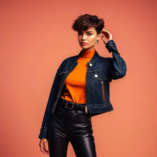 Undercut Pixie hairstyle on young woman, wearing casual shirt, in urban alley, captured in fashion editorial style with dramatic backlight.