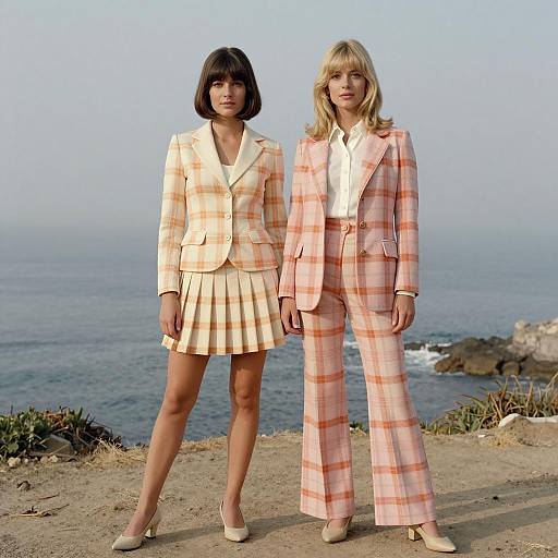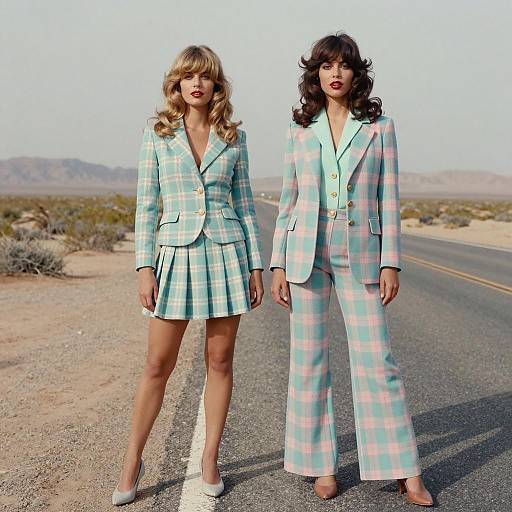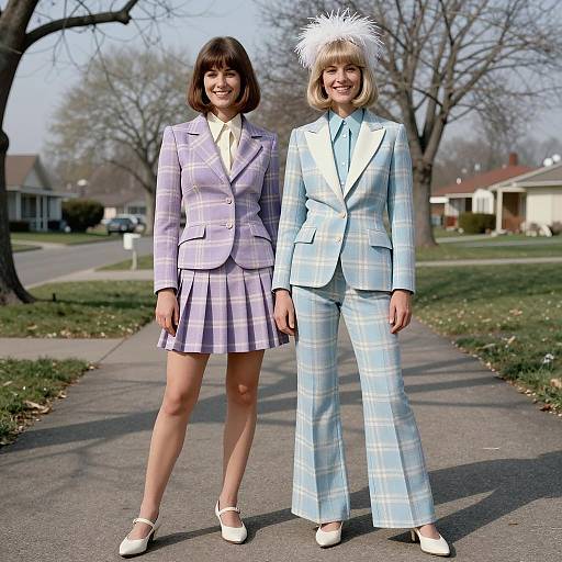 Three young men standing close together. All have fair skin, dark brown hair, and blue eyes. First man on left wears plaid shirt, gestures with right hand. Middle man in gray patterned shirt with dark collar. Right man in red and beige plaid shirt, arms at sides. Background: green shrubs, white fence. All have intense expressions, looking off to the right. Greenery and trees in background. Mid-20th century fashion style.