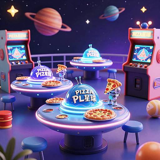 A sillied alien creature with big eyes, depicted in a retro sci-fi graphic novel style. Surrounded by vibrant abstract planets against a clean white backdrop.