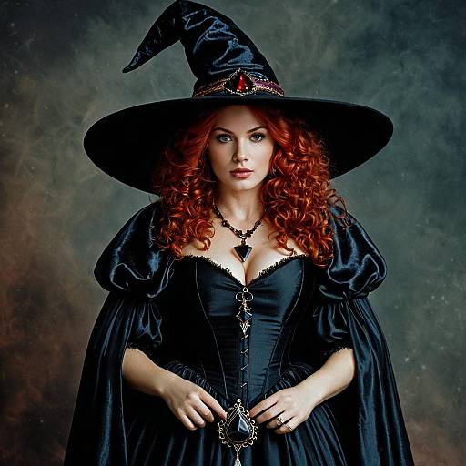Photo. Stocky woman, Wavy Lob, witch outfit, Wide-brimmed hat with deep purple felt and feather accent, dreamlike atmosphere