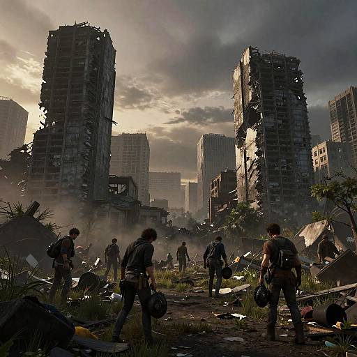 abandoned dystopian world, bodies wandering aimlessly among ruins, discarded robots tangled in debris, an overgrown city in shades of gray, forgotten memories etched in stone, digital painting masterpiece, trending on artstation and pixiv