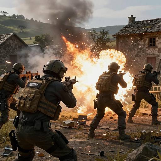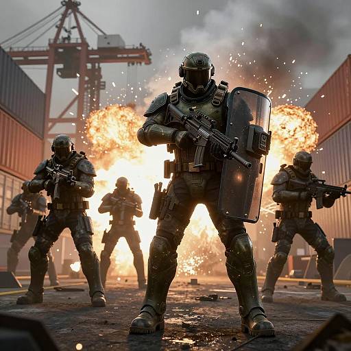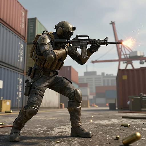 Cinematic close-up of a rugged mercenary gripping a rocket launcher tightly while preparing to fire in an abandoned industrial complex.