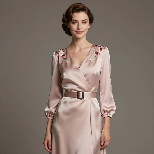 pre loved designer dress, photograph of a woman wearing a light blue floral dress, sleeveless, full skirt, pink and red roses with green leaves, standing against a plain beige background, long wavy brown hair, neutral expression, light skin, no visible accessories, standing pose, soft lighting, casual fashion, vintage style, full body shot, realistic ure, slight shadow under dress, elegant and feminine, dress slightly flared at the bottom, blue underlayer visible, realistic colors, studio shot