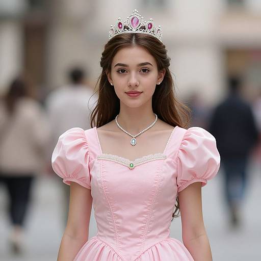 princess peach kart costume,1girl, solo, blonde hair, long hair, blurry background, pink dress, realistic, puffy sleeves, blurry, crown, skirt, tiara, pantyhose, detached sleeves, standing, dress