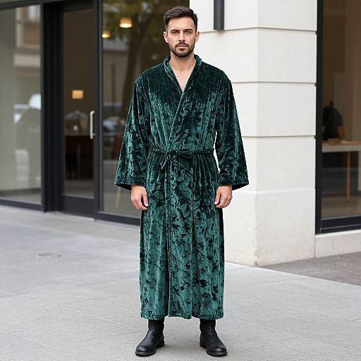 green velvet robe costume, photorealistic portrait of a woman, green velvet robe, tied with a matching green belt, dark brown hair in an elegant side part, serious expression, blurred outdoor background, street setting, overcast lighting, medium shot, slight depth of field, casual elegance, natural makeup, green robe details, medium skin tone, modern fashion, realistic ures, soft focus background, stylish, contemporary look