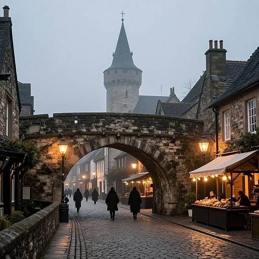 dreamy forest with towering trees and a distant view of ancient stone bridge
