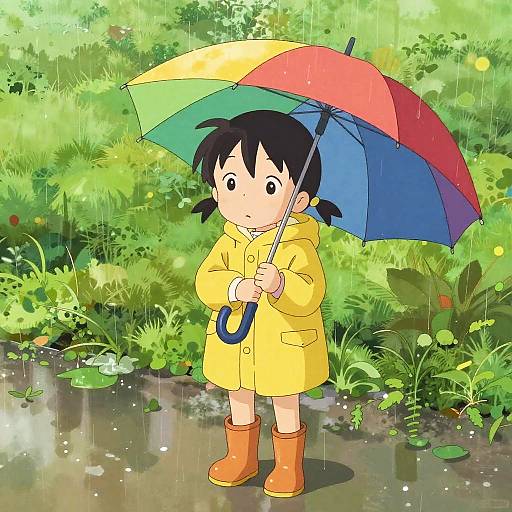 A childlike figure radiating playful innocence, with spiky red knots and a cozy hoodie and patterned joggers, playing in a rainy park under a colorful umbrella.