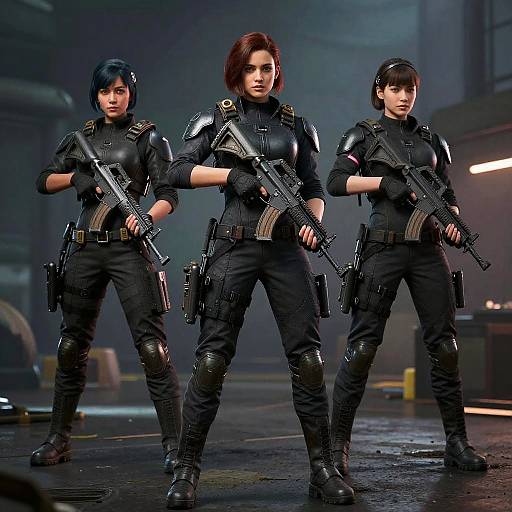 Rainbow Six girl characters assembling for mission, tactical uniforms with various gadgets, city at dusk backdrop, intense focus, realistic textures, sharp detail, cinematic lighting