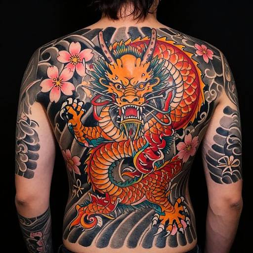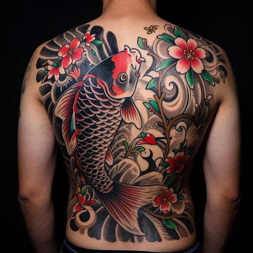 bold watercolor neo-traditional anime tattoo design of carp leaping from swirling water, entwined with lotus flowers, coral reef patterns, sakura petals, wind bars; bold black outlines, fine dotwork and sumi-e washes, subtle watercolor bleeds, iridescent gradients and gold accents, deep indigo shadows, negative space clouds, balanced asymmetry and sweeping motion, ribbons and bells in motion, tranquil yet dramatic mood, high-detail linework, needle-aware detail density for clean healing, flash sheet styling, parchment paper texture, crisp edges, elegant composition.