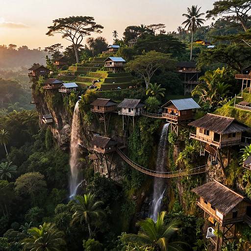 Fantasy landscape of a mossy ruin village in the jungle canopy, with bridges, lush green trees, and an aerial view of broken stone bridges.