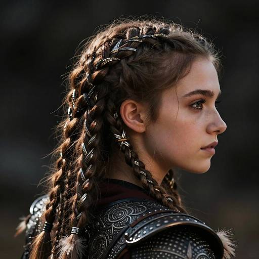 Dutch Braids hairstyle on young woman, wearing bohemian dress, in rustic library, captured in fashion editorial style with warm candlelight.