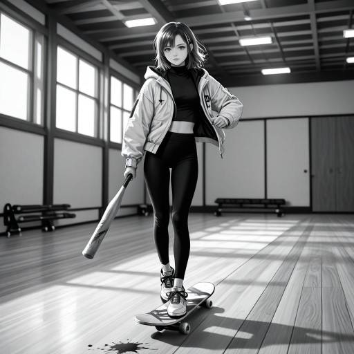 full body, adachi_rei, 1girl, solo, hint of smile, looking at viewer, medium hair, hairclip, detailed parka with hood down, open jacket and turtleneck, leggings, sneakers, holding baseball bat, blood splatter, monochrome, greyscale with spot color, dramatic light and shadow, intense mood, open dojo, skateboarding, chalk sketches, artistically patched denim
