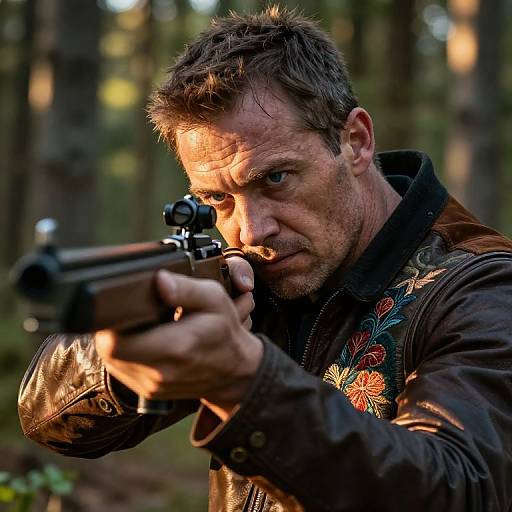Close-up of a man with a stocky physique, shot on a Canon EOS camera with an 85mm f/1.4 lens, highlighting intense gaze.