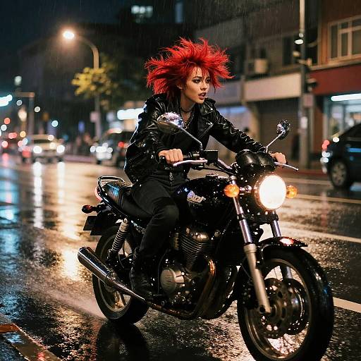 Woman with long brown hair, wearing a red fur jacket, red pants, and red high heels, sitting against a solid red background. She has red lipstick, looking to the side with a slight smile. Her right hand touches her face. The red fur ure is prominent. She is centered in the frame.