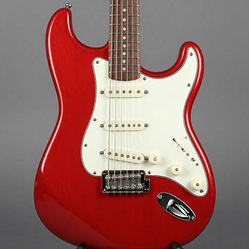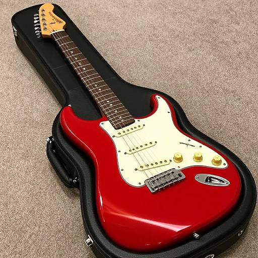 Flat doodle-style icon of a guitar, using clean design with brown, cream, green, and red, isolated on white background, ready for digital use, minimalistic and clear