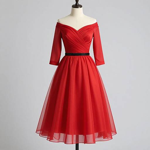 Woman, chic style, cotton A-line dress in red, thin straps, straight neckline, knee-length, fitted silhouette, silver ballet flats. --sref 1404