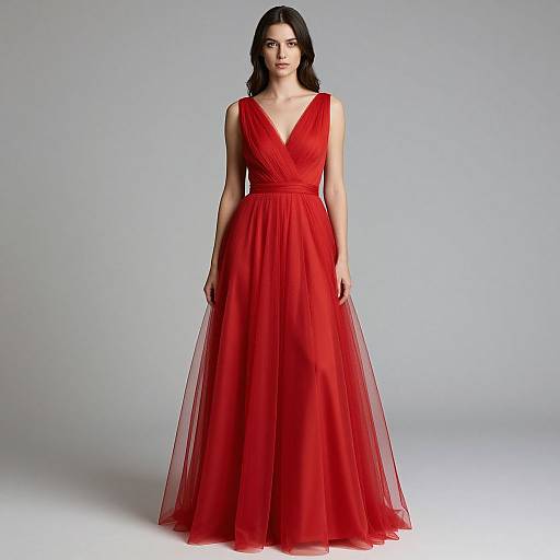 Woman, playful summer style, ruffled red dress with polka dots, square neckline, sleeveless with ruffle details on the straps, asymmetrical ruffle hemline, knee-length at the front with a longer flowing back, plain white studio background. --sref 1404