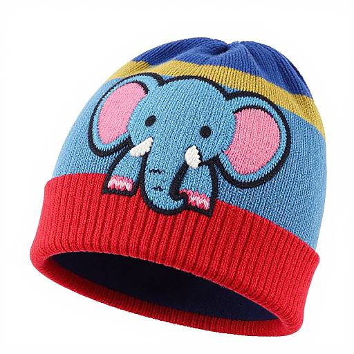 A baby with blue eyes is wearing a beige knitted hat with a red flower on the top.