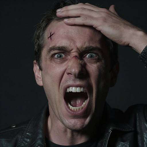 Close-up of a man with medium-length dark hair, wearing a red, frayed headband, and a dark shirt. His blue eyes are intense, and his expression is serious. Background is blurry with indistinct shapes. The man is centered in the frame.