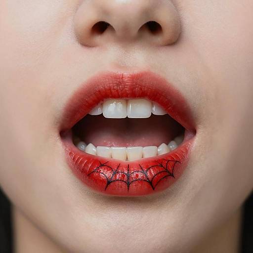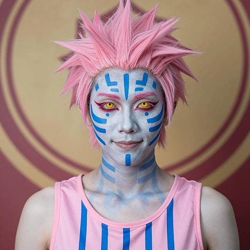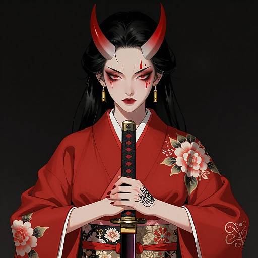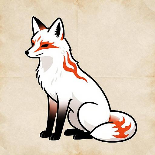 Photograph of a worn, white, mask with dog-like ears, intense frowning eyes, red arched eyebrows, red eyes, red mouth with teeth, black background. Mask's ure is rough with visible wear and tear.