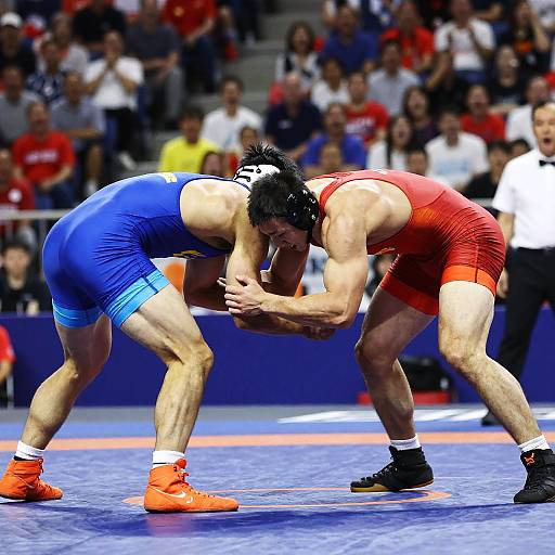 energy sci fi sword duel between two cybernetic fighters, glowing red and blue blades clashing, sparks and energy arcs flying, neon-lit urban arena, high intensity, dynamic composition