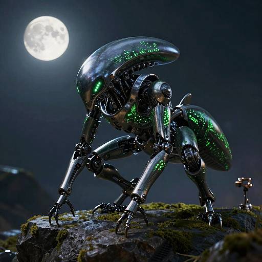Sigma creeper depicted as a stealthy insectoid robot, sleek metallic body with green bioluminescent patterns, crouched on a mossy rock under moonlight, high detail sci-fi art
