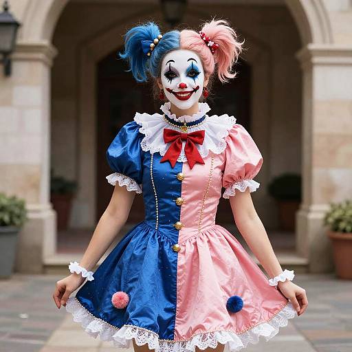 harlequin fancy dress ,clown, solo, facepaint, multicolored clothes, mask, blurry background, blurry, bow, jewelry, looking at viewer, long sleeves, facial mark, male focus, bowtie, makeup, red bow, 1girl, 1boy