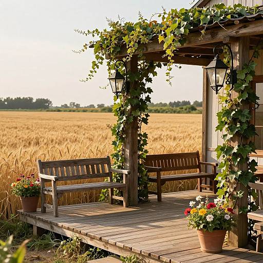 A rustic wooden porch of a historic barn, lit by shimmering fireflies, featuring a silhouette of a banjo and washboard, with a backdrop of golden wheat fields swaying gently in the breeze, dreamlike and magical ambiance