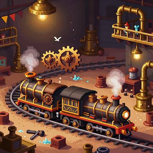 An abstract artwork of a swirling vortex of clock gears and sand, with rusty cogs, glowing particles, and flowing grains, in a mystical desert at twilight, created in steampunk-inspired mixed media with energetic strokes, mysterious and immersive