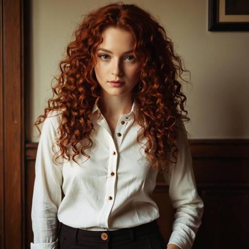a realistic portrait of a young woman with long curly red hair and striking eyes, wearing a fitted white button-up shirt and slim black pants, soft and subtle lighting accentuating smooth skin texture, warm brown and beige colors, detailed facial features, vintage interiors with warm brown tones