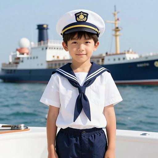 A man dressed in a ship captain costume stands confidently on the deck of a boat, wearing a navy blue double-breasted coat with gold buttons and captain's insignia on the hat and sleeves. The background features a harbor with visible ships and industrial structures, emphasizing the maritime theme in a realistic cosplay style.