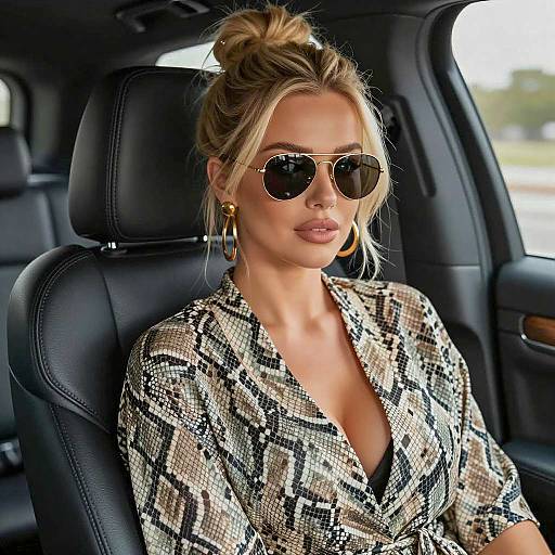 a close-up portrait of a young woman with golden blonde hair and subtle makeup, wearing a beige ribbed top with a lace-up front detail, sitting inside a car with natural warm lighting, highlighting her soft freckles and warm skin tone, casual modern fashion style