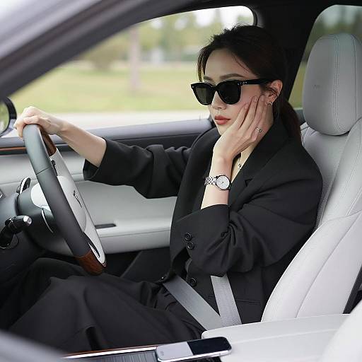 monochrome, greyscale, 1girl, solo, sitting, young woman, hand on own face, beach sunset, sports car, leather jacket, serene, silhouette