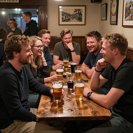 Group of seven people in a room. Man in gray suit with crossed arms, brown hair, and sunglasses stands left. Woman with long brown hair, dark dress, and scarf holds plates in center. Man with glasses, green jacket, and brown hair stands right. Others in background, diverse appearances, casual clothing. Clock on beige wall behind group. Bright lighting from windows in background.