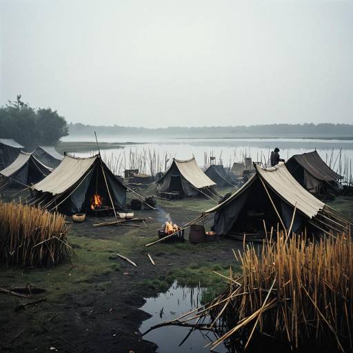 An antique West African hut in the midst of a foggy early morning during a warm summer evening. The scene radiates a vibrant color palette that exudes energy and excitement, currently trending on ArtStation, inspired by Simon Stålenhag and John Atkinson Grimshaw.