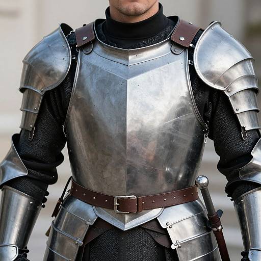 feet out of frame, 1boy, solo, muscular, young male with a athletic build, short dark hair, bright blue eyes, and a tattoo on his arm, red cape, facial hair, beard, stubble, closed mouth, smile, shoulder armor, pauldrons, breastplate, leather armor, gauntlets, fingerless gloves, pelvic curtain, leg armor, kneeling with sword raised, black background