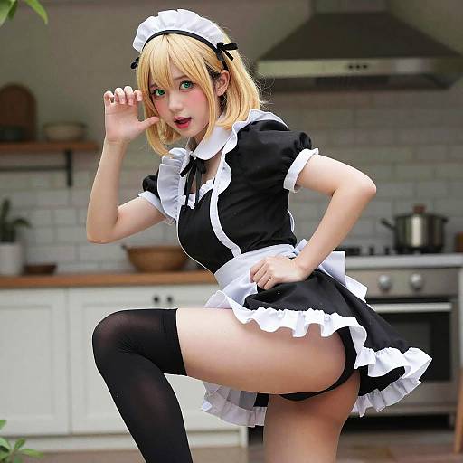 blushing maid, short chestnut hair, petite build, (Maid Outfit:1.3), classic maid dress, Vinland Saga, Deep mocha fade studio background