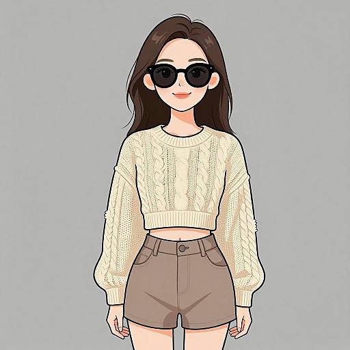 Woman, casual, olive green knitted cardigan, long sleeves, form-fitting, light blue denim shorts, classic black belt with silver buckle, brown ankle boots