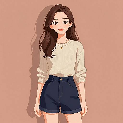 woman with pretty face and pretty hair. smiling Woman, casual chic, ribbed-knit cardigan in dusty pink, V-neckline, front button closure, billowy bishop sleeves, cinched cuffs, cropped hem, paired with a pleated mini skirt in cream color, high waist, flared silhouette, red nail polish, photo studio background. --sref 1467