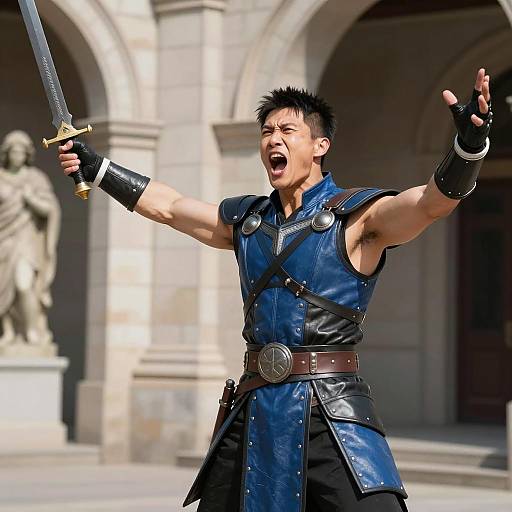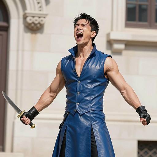 full body, 1boy, solo, muscular male, a powerful man with weathered skin kissed by the sun, short spiky brown hair, fierce stormy gray-colored eyes, defined anatomy, abs, pectorals, angry expression, clenched hand, clenched teeth, looking at viewer, gold earrings, detailed clothing, denim jacket, tactical belt, skinny jeans, running shoes, black background
